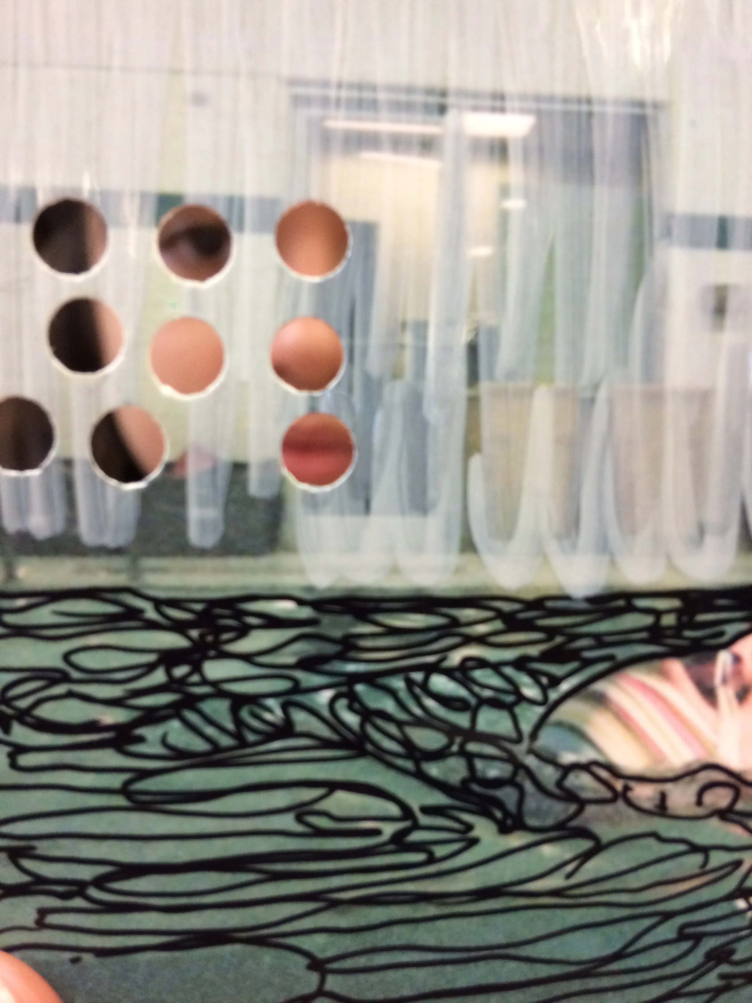 My big plan was to take great swimming pictures of my friends at the pool last Saturday. Full disaster. The taking of the pictures was a lot of fun ,but the film from the Fugi underwater camera was terrible. The quality was terrible. No, it was not me- the pool was bright, above and below the water and I did not go deeper than 4 feet. It cost me a small fortune to develop the film and all my husband could say was, "Throw them all in the garbage"! I had to agree with him but before I could toss them, I thought that maybe I could give them a face lift. I punched hole's into one of the photo's and applied white and black marker to it. I then realized that our Art Club challenge was to take pictures through "holes" and had an epiphany! The pictures below are pictures of Kaitlyn taken through one of my swimming pictures. The effect was surprising!
