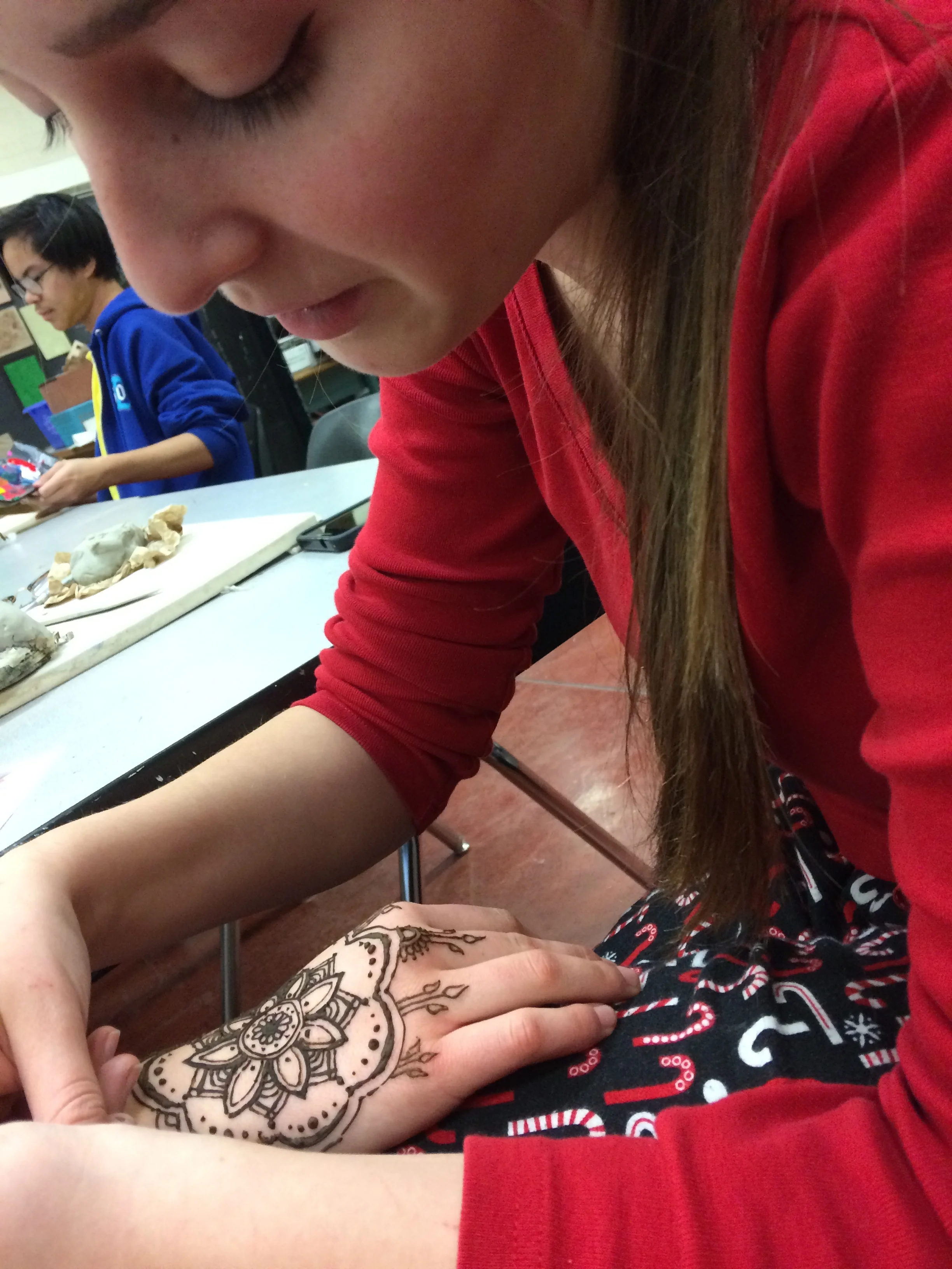 Today in Art Club, we took on the challenge of learning how to do Henna Tattoo's. "Easy Peasy,"I thought to myself. Wrong! I have a new found respect for the artists that can freehand on those beautiful designs with such precision. My apologizes to Ghazal for having to have wear a shaky and blobby design for the next three weeks! Hopefully practice will make perfect:)