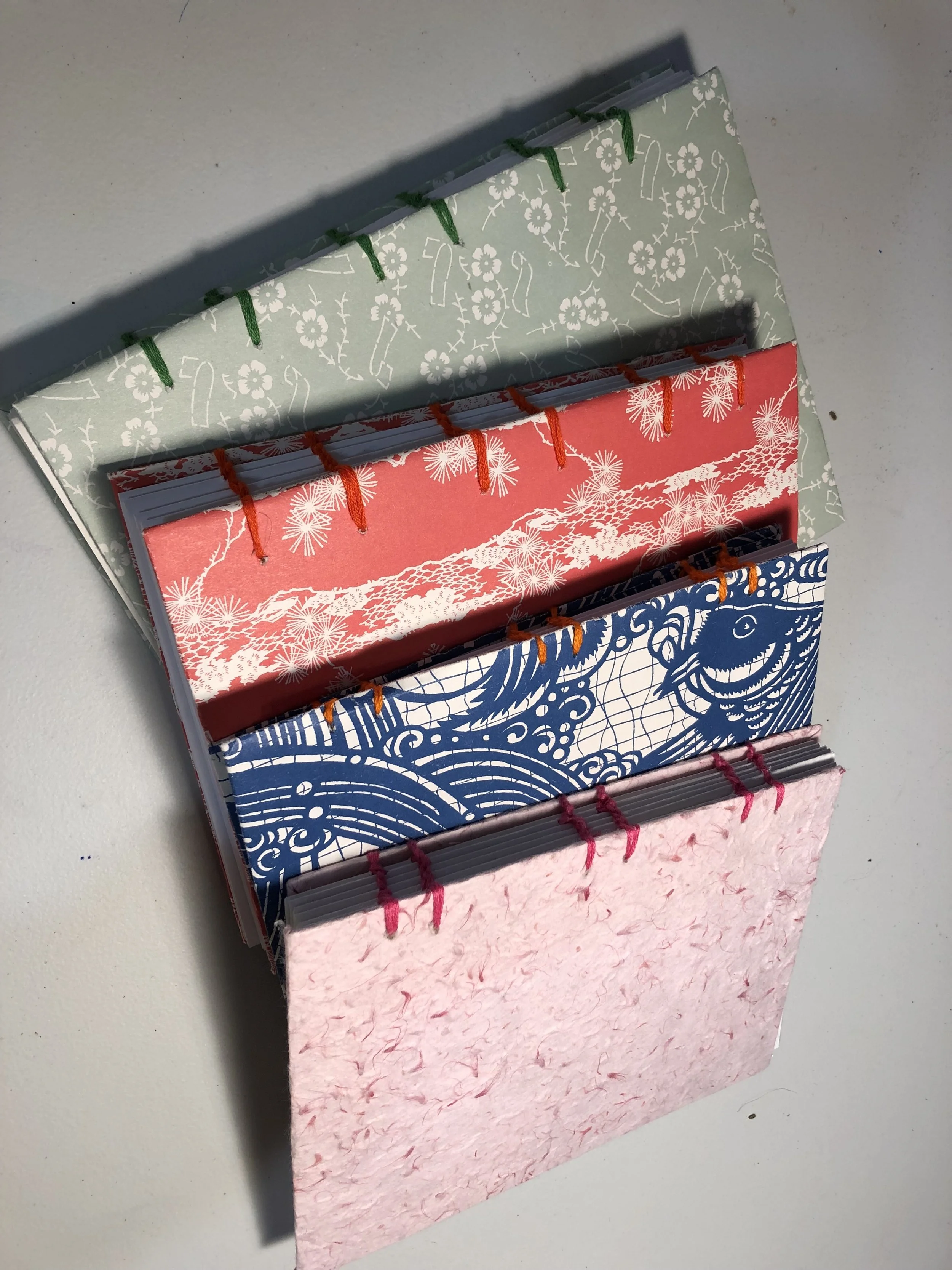 I purchased a book on book binding and book making because I thought some of my students would like to make their own sketchbooks. Little did I know that I would become addicted to the process myself! The most important stitch in the whole process is the “Coptic Stitch” used the bind the papers and cover together. I am really not a great follower of instructions so I watched how to stitch on Youtube. I have to admit, something like this is really out of my comfort zone because in order for your book to look like a book, everything has to be perfect. The papers cut perfectly, the holes evenly punched, and the stitching neat and tidy. This is everything I am not!