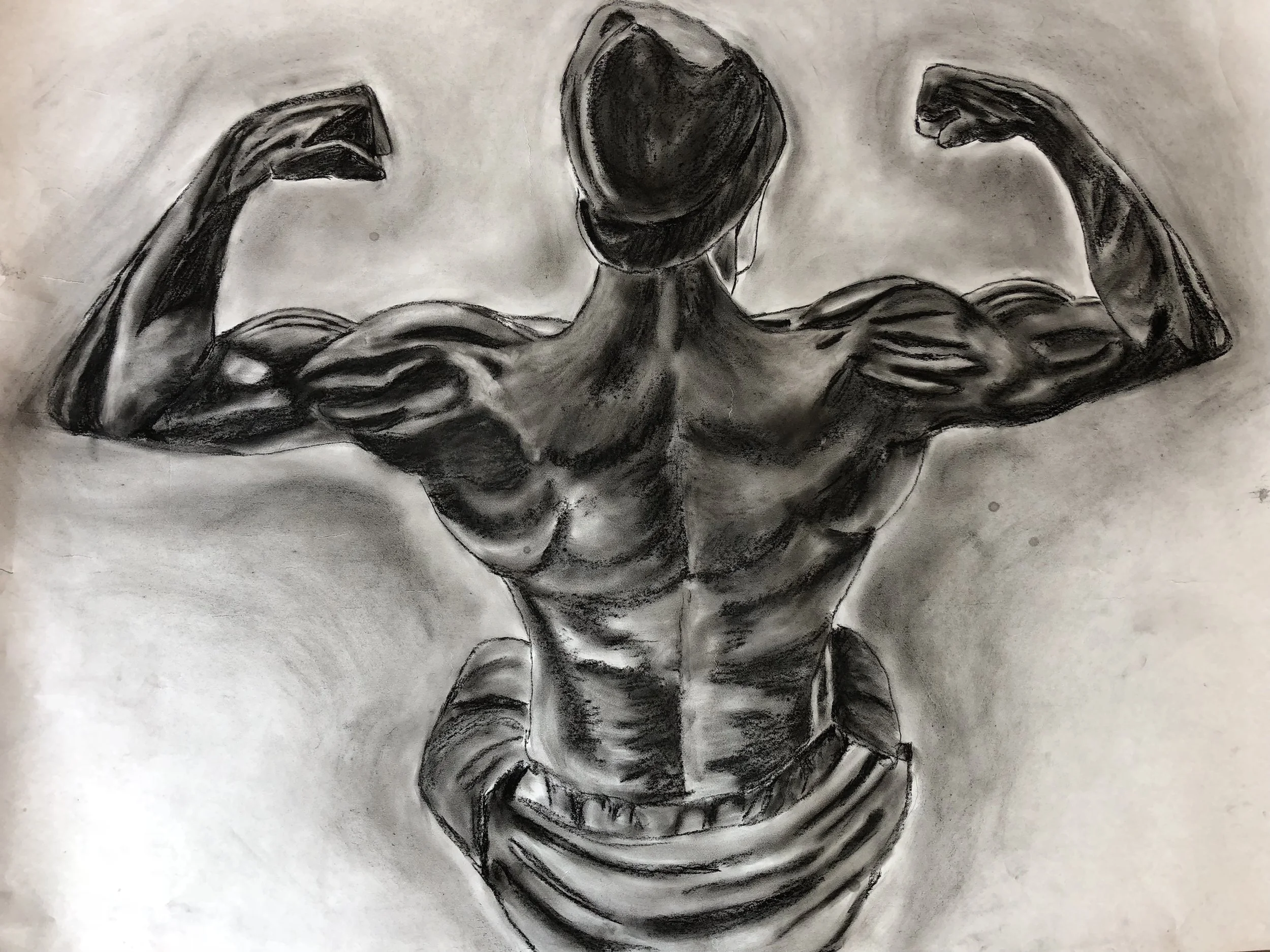 My son sent me a picture of him working out at the gym. The shadows, shapes and lines were amazing and I felt the need to do a piece of him on a really large piece of white cartridge paper and charcoal. He loved it- success!