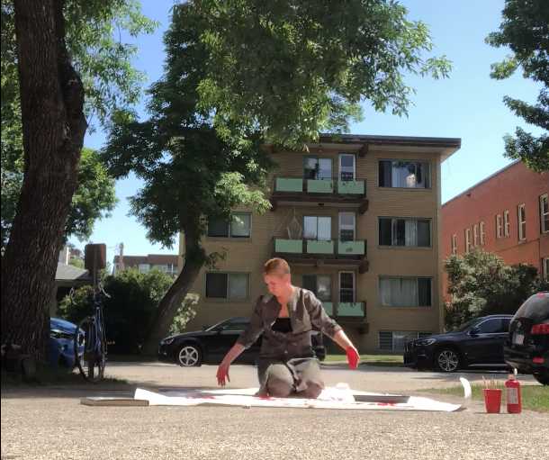 What better way to express movement with color is to totally immerse yourself in it- to really become one with it, to feel it, to move with it. The goal was not the end result but the process- what or she would feel when encountering the paper with her body and paint. Nothing was preplanned, she moved on instinct and emotion. She called the finished piece "Rebirth" - the start of a new beginning for her as she leaves Calgary and moves on to Emily Carr in August.